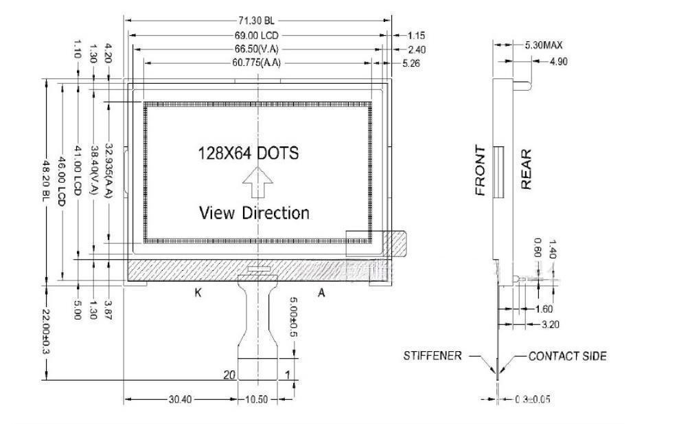 ESHX12864-727 is STN blue dot maxtrix lcd modules 128x64 dots 1/64 duty,1/9 bias,VOP=9.0V, display mode is STN(BLUE)/TRANSMISSIVE/NEGATIVE and view angle is 6:00 CLOCK,driving IC is ST7567, 8pins with white backlight,assembly type is COG